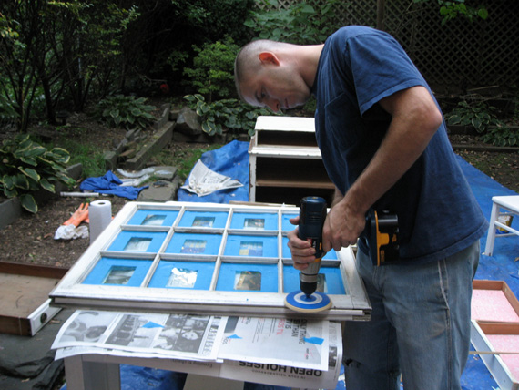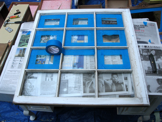 We started the process of prepping the windows during out 48-hour furniture-refinishing weekend. Here, we taped up the windows to prevent the new coat of paint from dripping on the glass.