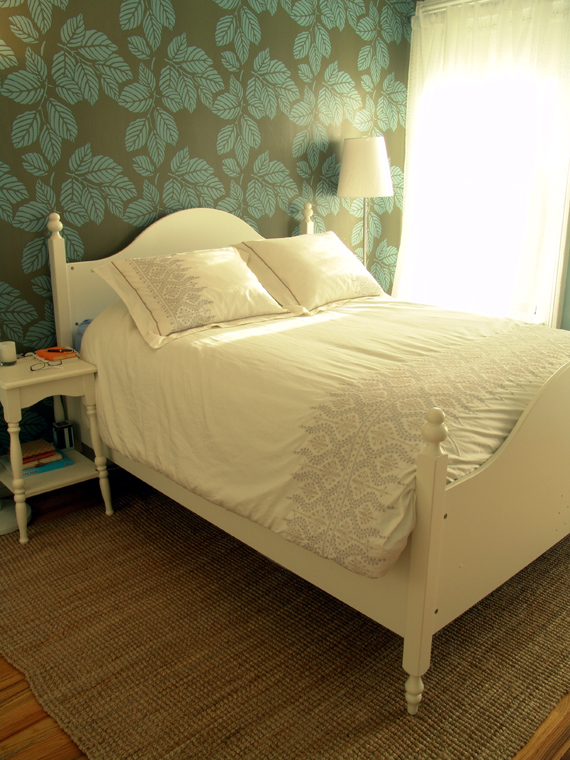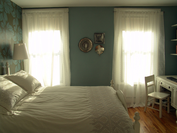 After a year of thinking about my guest bedroom valance project, it finally came to fruition. Why did it take so long? Because it took me forever to convince Mike that this über-DIY project was feasible. The plan was to build a window valance out of wood, wallpaper it to match our accent wall, and secure it to the inside of the window. Easy? We were about to find out.