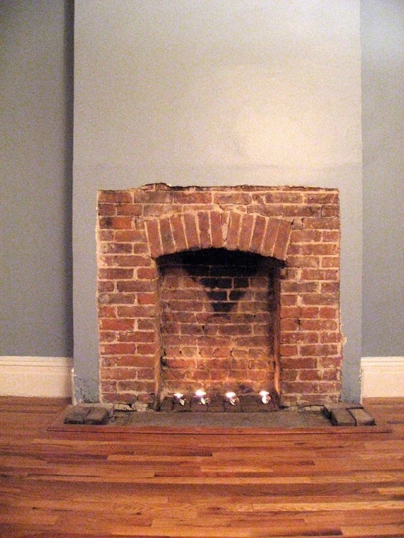 In previous blogs about my empty apartment-makeover, you’ve seen the pretty fireplace but until now, I’ve been hiding its ugly twin from you. It’s a cookie-cutter cherry marble fireplace that has been boarded over with faux marble, and it’s been looming in our master bedroom since the former homeowner left. We knew it was probably covered for a reason, but we had to find out for ourselves. When our handyman Vince was over fixing up a few things, we asked him to add, “dismantling the fireplace” to the list. Vince pried the face off, and he phoned us immediately, “Your only choice is to cover this thing back up.” It turns out that our former chimney had imploded about fifty years back and its rubble and soot was still preserved behind this faux marble. It was the dirtiest, most daunting sight I’d ever seen. I am not going to lie. I was with Vince, but my man Mike was determined to excavate. I’ll thank him now, but at the time I thought he was crazy—mainly because I was his main source of labor. The project at hand consisted of removing hundreds of pounds of debris, carrying it down three flights of stairs, chipping away the plaster fireplace surround, exposing the brick behind it, and sanding down the concrete remains—not exactly items on my home design résumé. Though skeptical, I too saw glimmers of an exposed brick fireplace filled with candles at the foot of our bed, and before you knew it, I was at Home Depot buying buckets and respiratory masks.