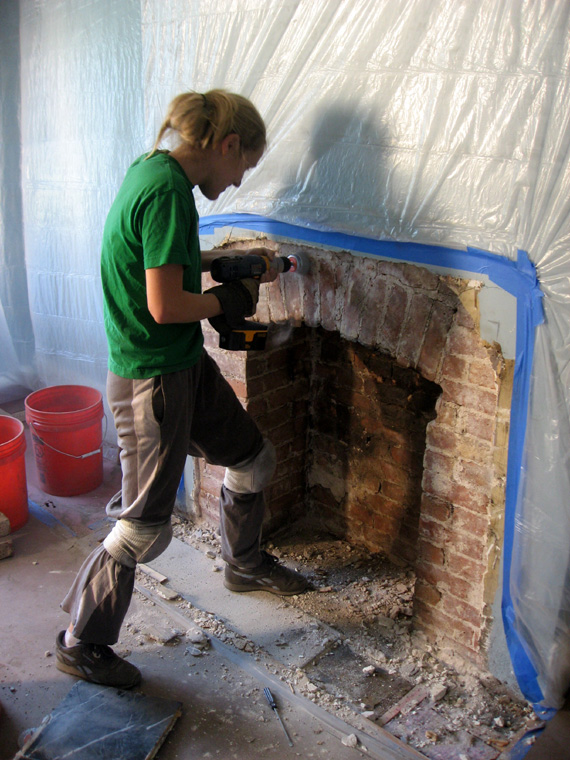 This is our fireplace, free of the imploded chimney, and me trying to clean up the concrete-speckled bricks. We did this by attaching a wire wheel to the end of a drill. A wire wheel, if you don’t know (because I didn’t), looks like the roughest Brillo pad ever created, and when it spins at top speed, it can pulverize concrete. We went over each brick until the bricks were smooth and red again.