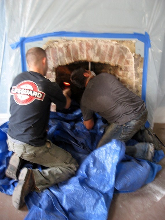 Removing the fallen rubble was exhausting but easy compared to dislodging the bricks at the top of the chimney. Mike and our brave friend, Scott, knocked the remains down with the longest pole we had handy: a golf ball retriever. Only Mike got pelted with a falling brick (his arm is slightly bruised, but he says it was worth it).