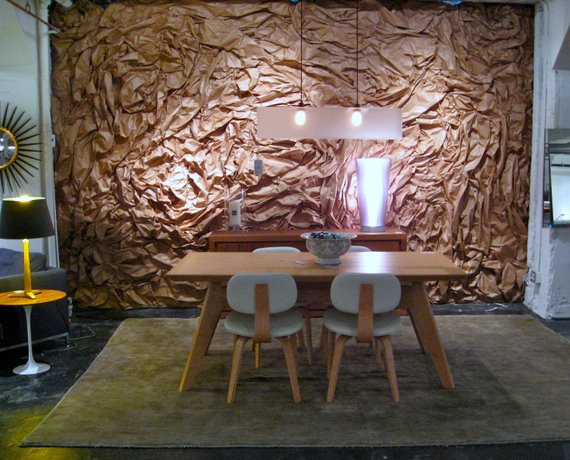 Koolhaus sold fabulous furniture and accessories but better yet . . . they had brilliant display ideas, like this craft paper wall covering. With the right lighting and deep wrinkles, this crumbled paper becomes the most dramatic accent wall.