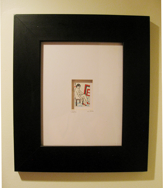I’ve never purchased art for the matting, until now. Set a quarter-inch deep with a massive white border, the matting makes this tiny picture seem so grand. Prints rarely even come this small (or warrant such a big frame) but if you look into the collectible world of early 20th-century cigarette trading cards, you’ll find more. Scenes of beautiful women, baseball players, cinema stars, and other popular imagery used to be printed on stiff pieces of paper and slipped into cigarette packs to keep the fags from bending and add a little Cracker-Jack surprise to the smoking experience. Though I would have probably purchased this frame even if I didn’t adore the card inside, the 1940s subject matter was a definite selling point. A Japanese woman lounging nude in a living room, with jelly rolls proudly exposed, sitting on a side table admiring her red high heels—what’s not to love? Plus, the Marimekko-like blue floral carpet is pretty spectacular. The simple pen drawing is wonderfully graphic and the scene a bit mysterious.